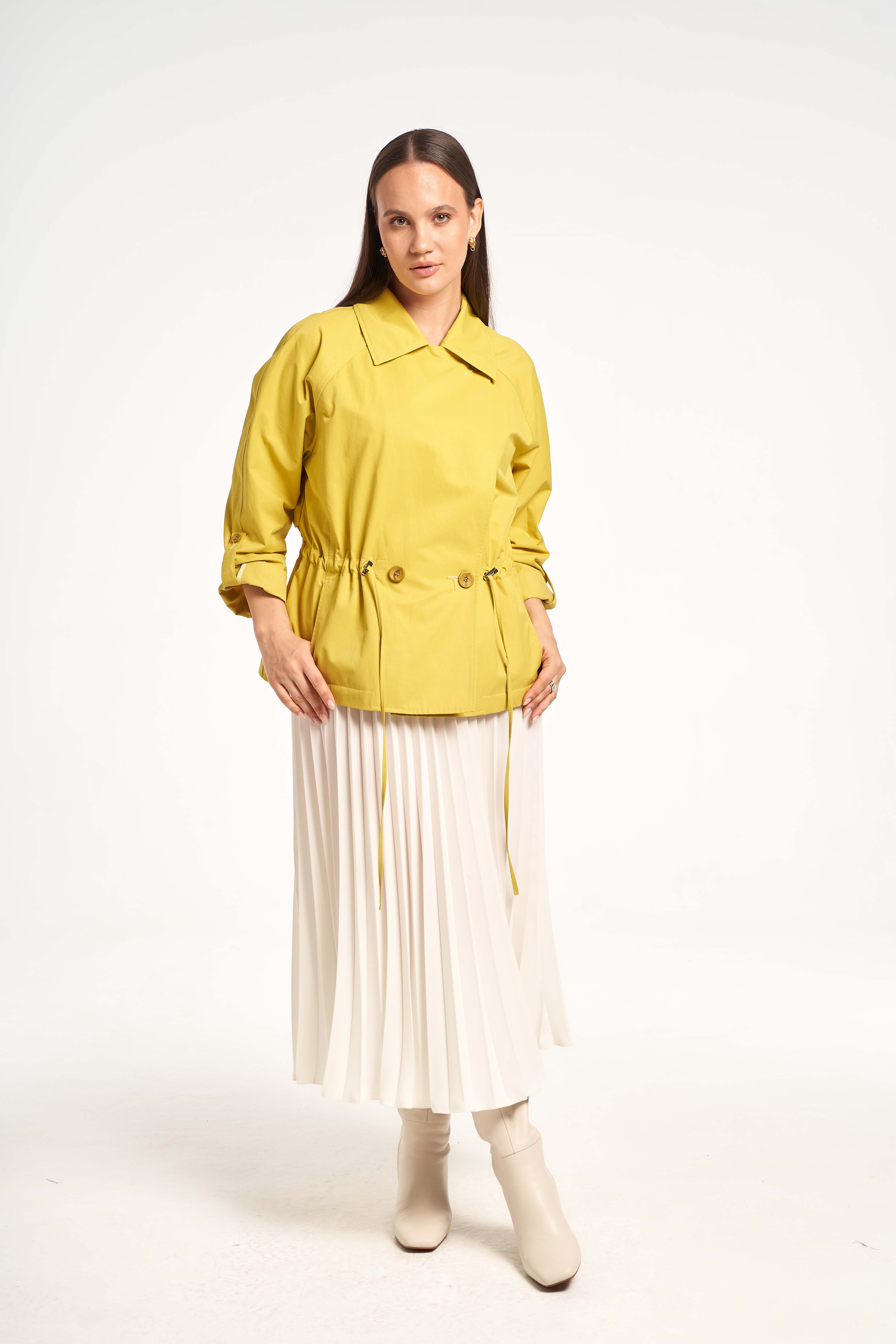 Жакет двубортный прямого силуэта с кулиской на талии. Длина чуть ниже линии бедер. Широкий английский воротник с лацканами. Рукава реглан с патами для отворота рукава. Боковые карманы в рельефных швах. Застегивается изделие на петли и пуговицы. На спинке – отлетная кокетка. Жакет выполнен без подкладки из плащевой ткани с высоким содержанием хлопка.