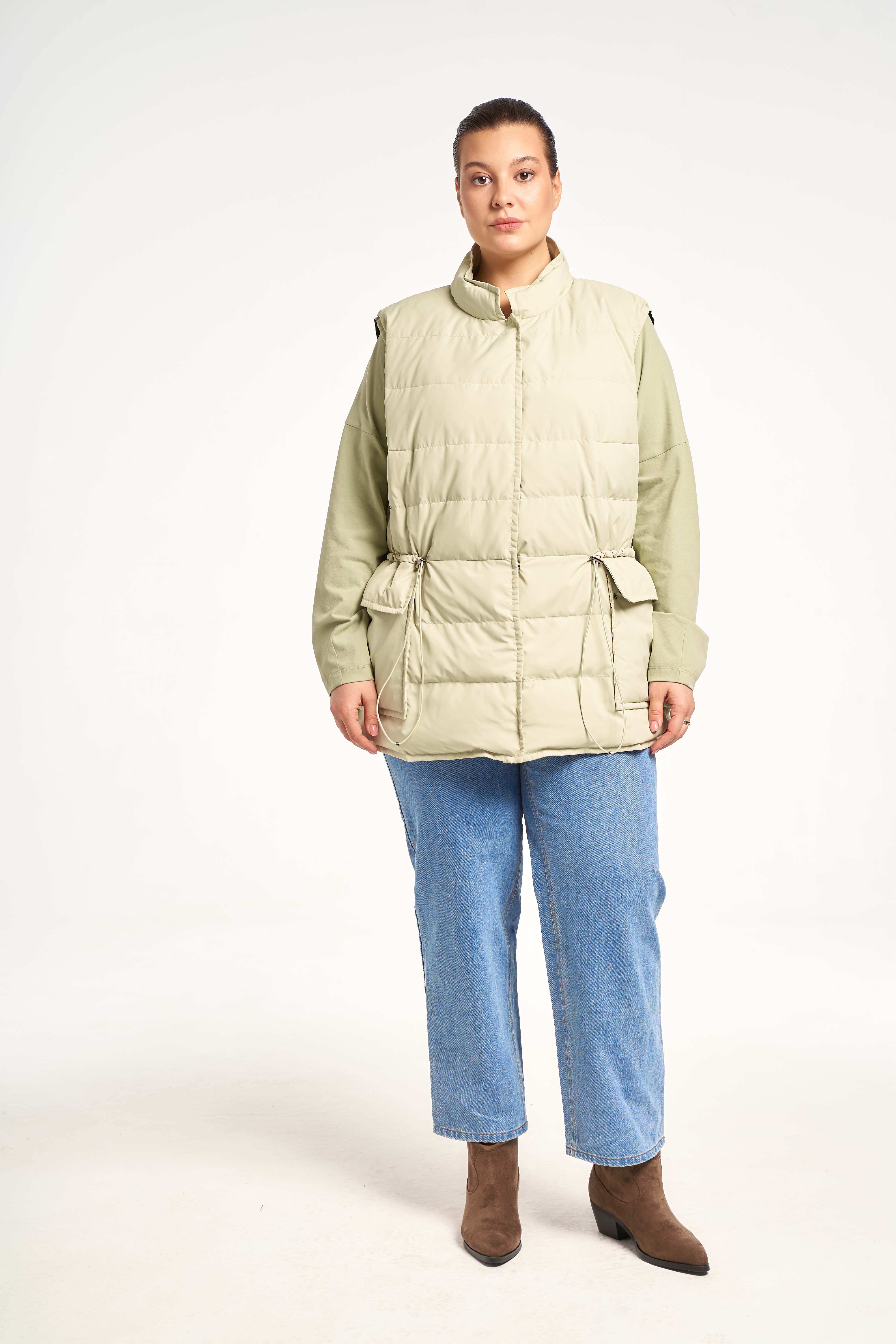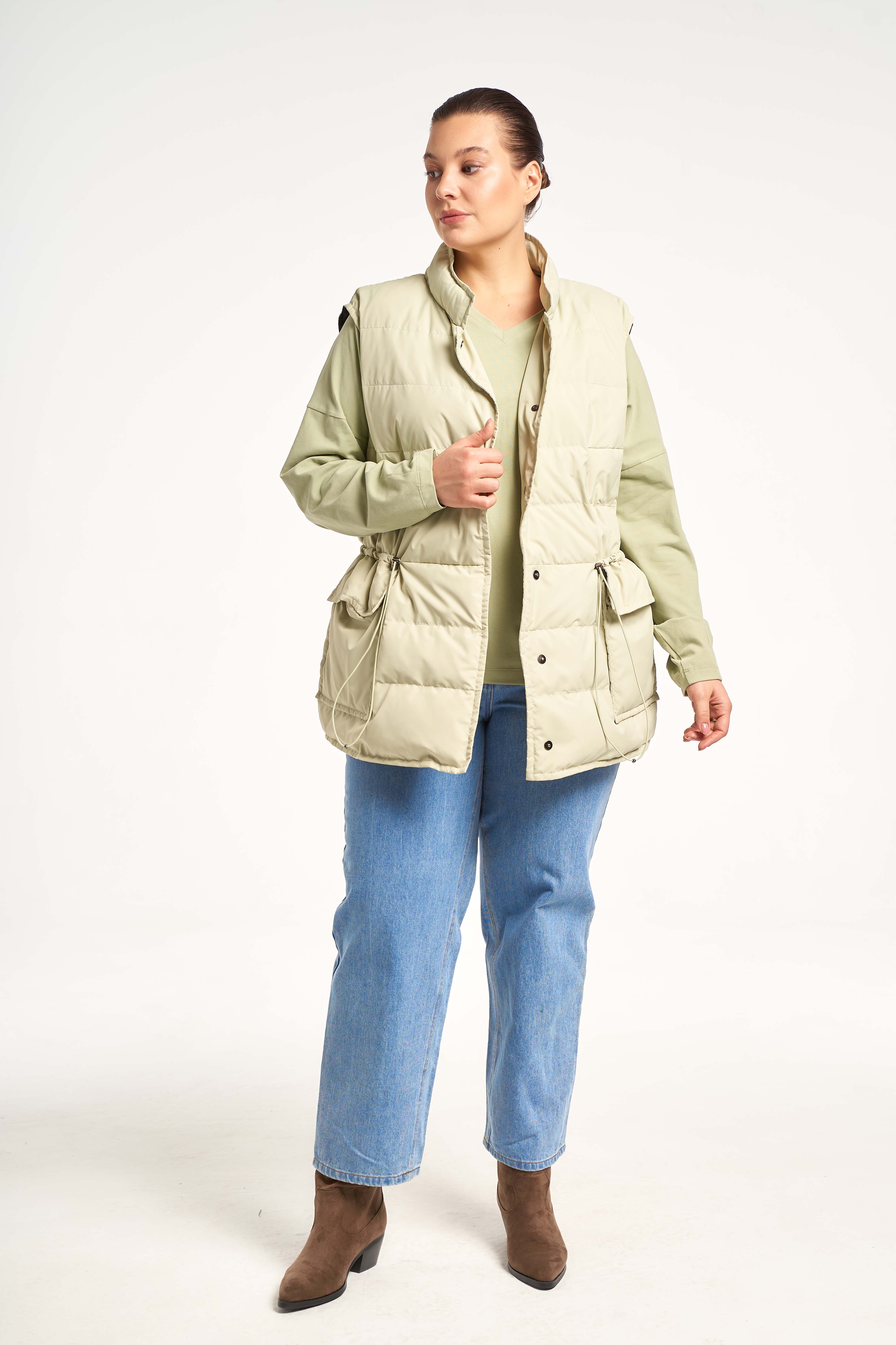 Легкий жилет прямого кроя с кулиской на талии. Воротник-невысокая стойка. Карманы накладные с клапанами. Застегивается жилет на потайные кнопки.