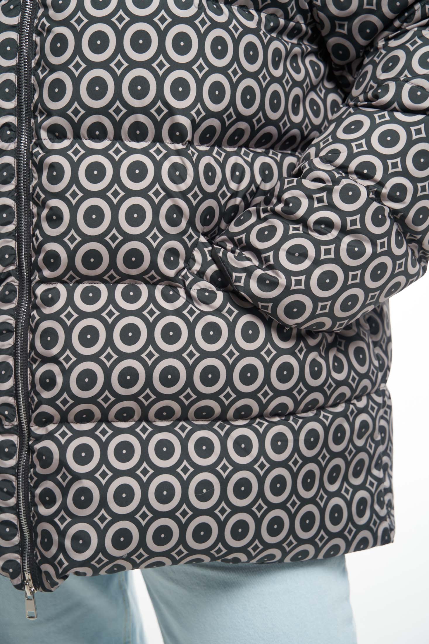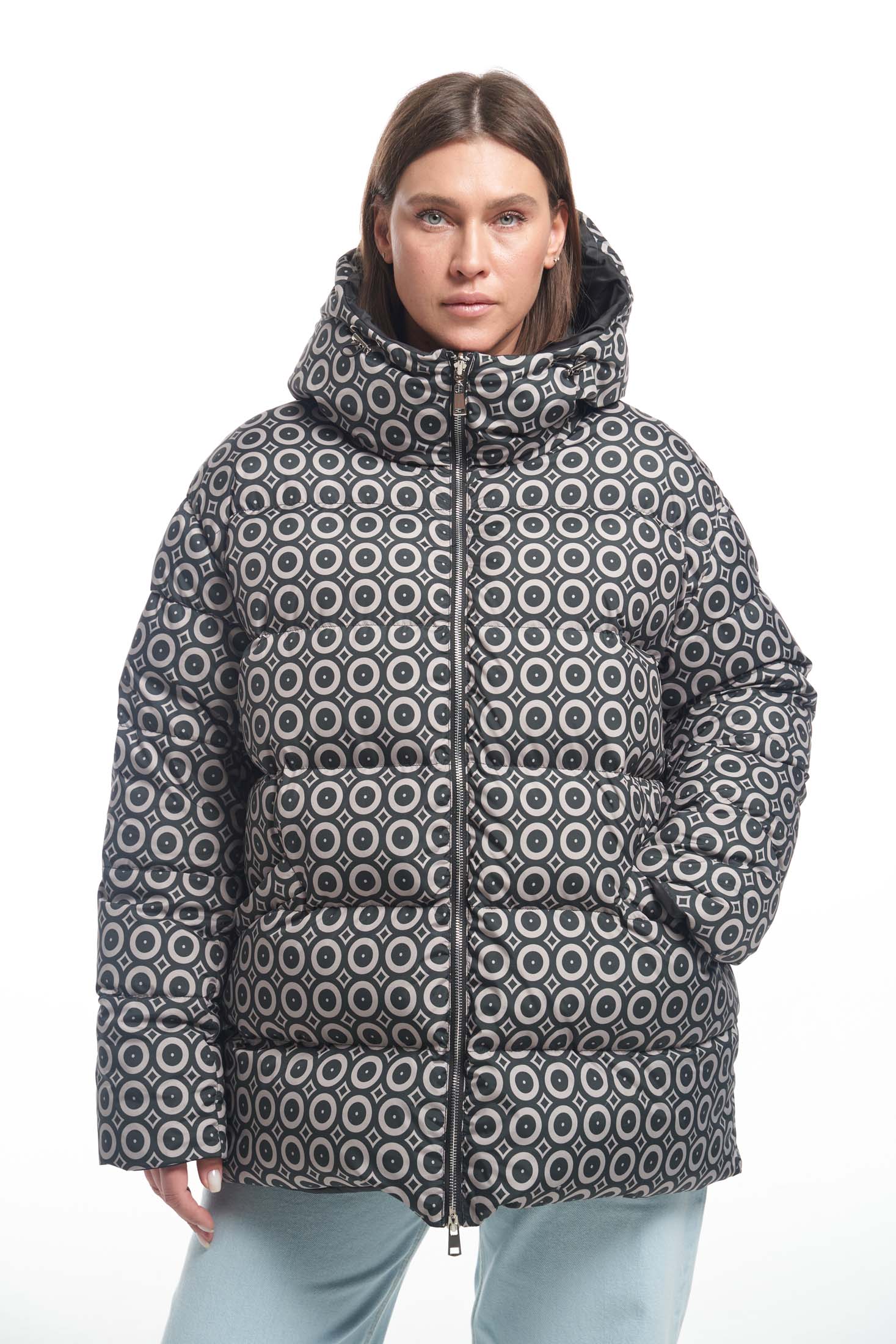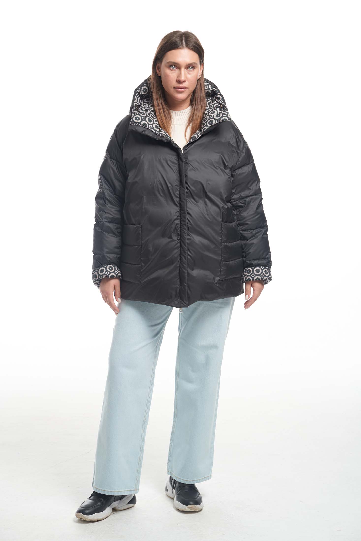 Двусторонний пуховик длиной чуть ниже линии бедер. Плечевой пояс немного спущен. Капюшон втачнойна высокой стойке. На капюшоне выполнена декоративная кулиска с резинкой. На однотонной стороне пуховика боковые карманы накладные. На принтованной стороне карманы прорезные с листочками. По низу изделия выполнена кулиска. Куртка застегивается на металлическую реверсивную молнию. При изготовлении применяется двухслойный пухпакет.